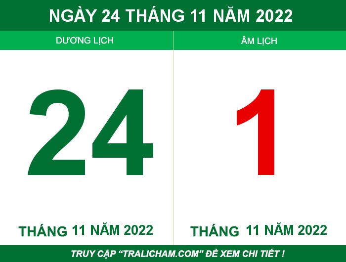 Bạn đang xem ngày 24 tháng 11 năm 2022 dương lịch tức âm lịch ngày 1 tháng 11 năm 2022. Bạn hãy kéo xuống để xem ngày hôm nay thứ mấy, ngày mấy âm lịch, giờ nào tốt nhất, tuổi xung khắc nhất, sao chiếu xuống, việc nên làm, việc kiêng cự trong ngày này.