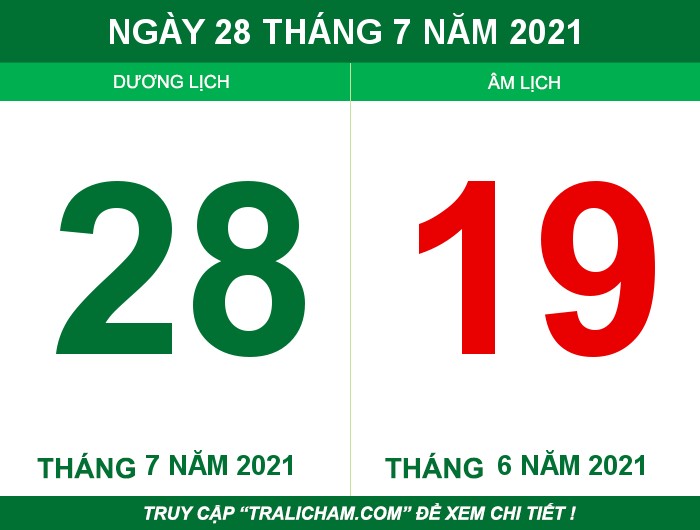 Bạn đang xem ngày 28 tháng 7 năm 2021 dương lịch tức âm lịch ngày 19 tháng 6 năm 2021. Bạn hãy kéo xuống để xem ngày hôm nay thứ mấy, ngày mấy âm lịch, giờ nào tốt nhất, tuổi xung khắc nhất, sao chiếu xuống, việc nên làm, việc kiêng cự trong ngày này.
