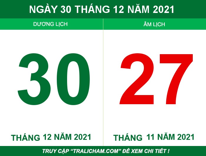 Bạn đang xem ngày 30 tháng 12 năm 2021 dương lịch tức âm lịch ngày 27 tháng 11 năm 2021. Bạn hãy kéo xuống để xem ngày hôm nay thứ mấy, ngày mấy âm lịch, giờ nào tốt nhất, tuổi xung khắc nhất, sao chiếu xuống, việc nên làm, việc kiêng cự trong ngày này.